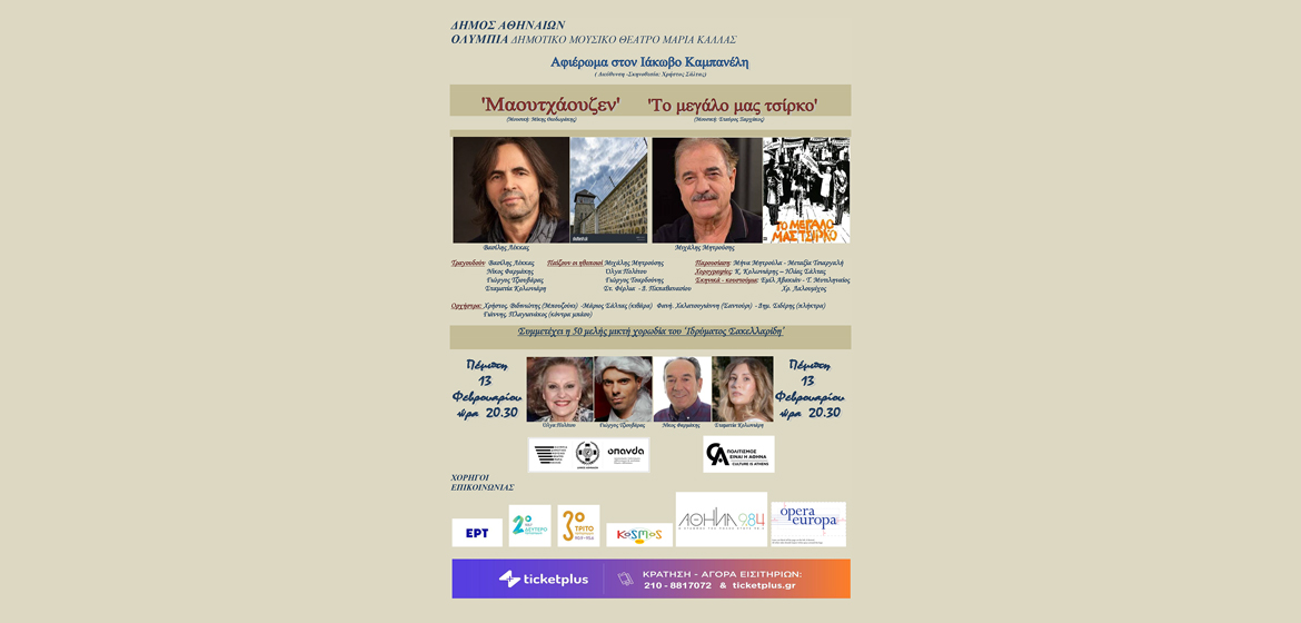 Ένα πλούσιο μουσικό αφιέρωμα στο έργο του θεατρικού συγγραφέα και ποιητή Ιάκωβου Καμπανέλλη, μέσα από τα δύο σημαντικότερα έργα του: «Μαουτχάουζεν», σε μουσική Μίκη Θεοδωράκη και «Το μεγάλο μας τσίρκο», σε μουσική Σταύρου Ξαρχάκου, φιλοξενεί το Ολύμπια, Δημοτικό Μουσικό Θέατρο «Μαρία Κάλλας» την Πέμπτη 13 Φεβρουαρίου 2025, ώρα 20.30. Η μουσικοθεατρική παράσταση ανεβαίνει σε σκηνοθεσία και μουσική διεύθυνση Χρήστου Σάλτα.